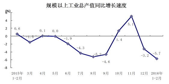 2016-03-15 来源:上海市统计局2016年1-2月,本市规模以上工业(以下简称工业)企业完成工业总产值4496.23亿元,比去年同期下降5.7%(见下图)。