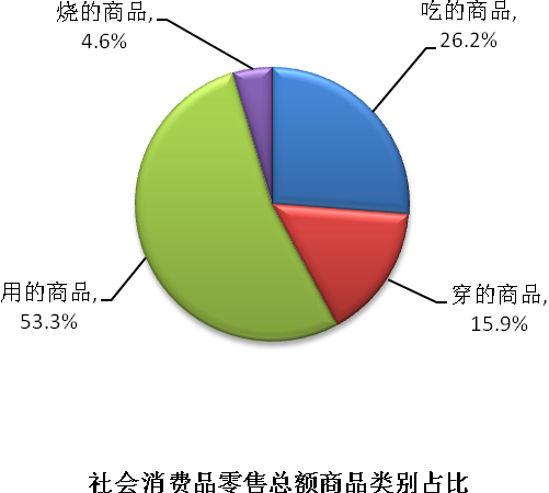 分商品类别看,1-2月份吃、穿、用、烧的商品零售额分别为445.69亿元、270.70亿元、908.32亿元和77.57亿元,分别占社会消费品零售总额的26.2%、15.9%、53.3%和4.6%。其中,吃、穿、用的商品分别增长4.2%、6.5%、10.1%,烧的商品下降7.3%。