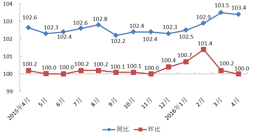 附图:2015年4月-2016年4月上海居民消费价格同、环比升幅走势