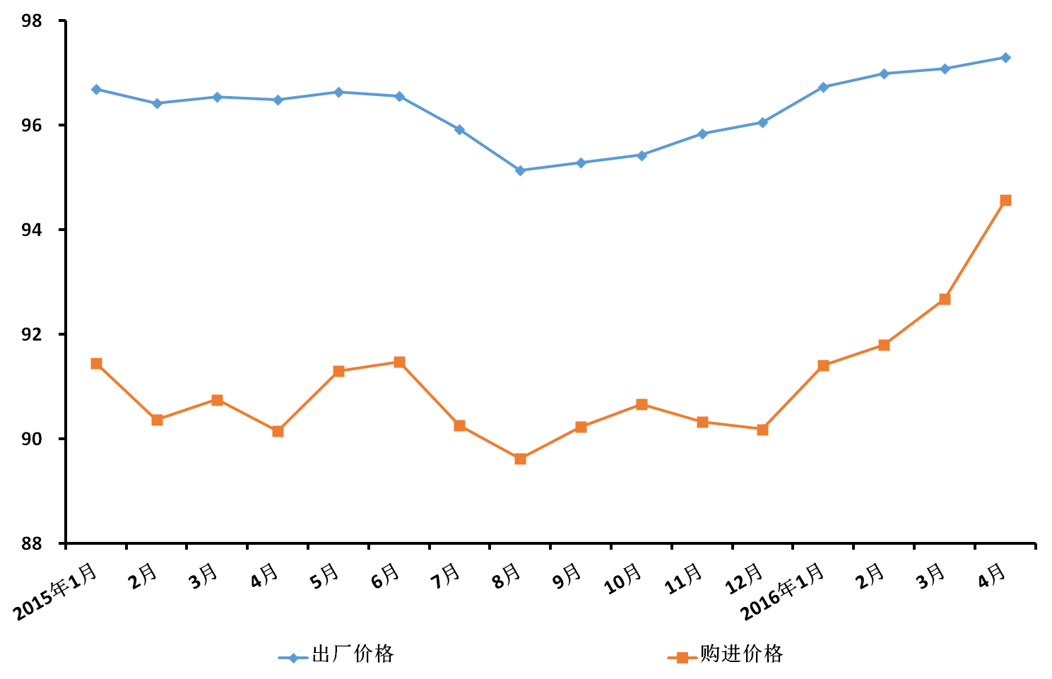 2016-05-19 来源:上海市统计局4月份,本市工业生产者出厂价格总水平比去年同期下降2.7%,降幅比上月收窄0.2个百分点;购进价格总水平比去年同期下降5.4%,降幅比上月收窄1.9个百分点(见下图)。