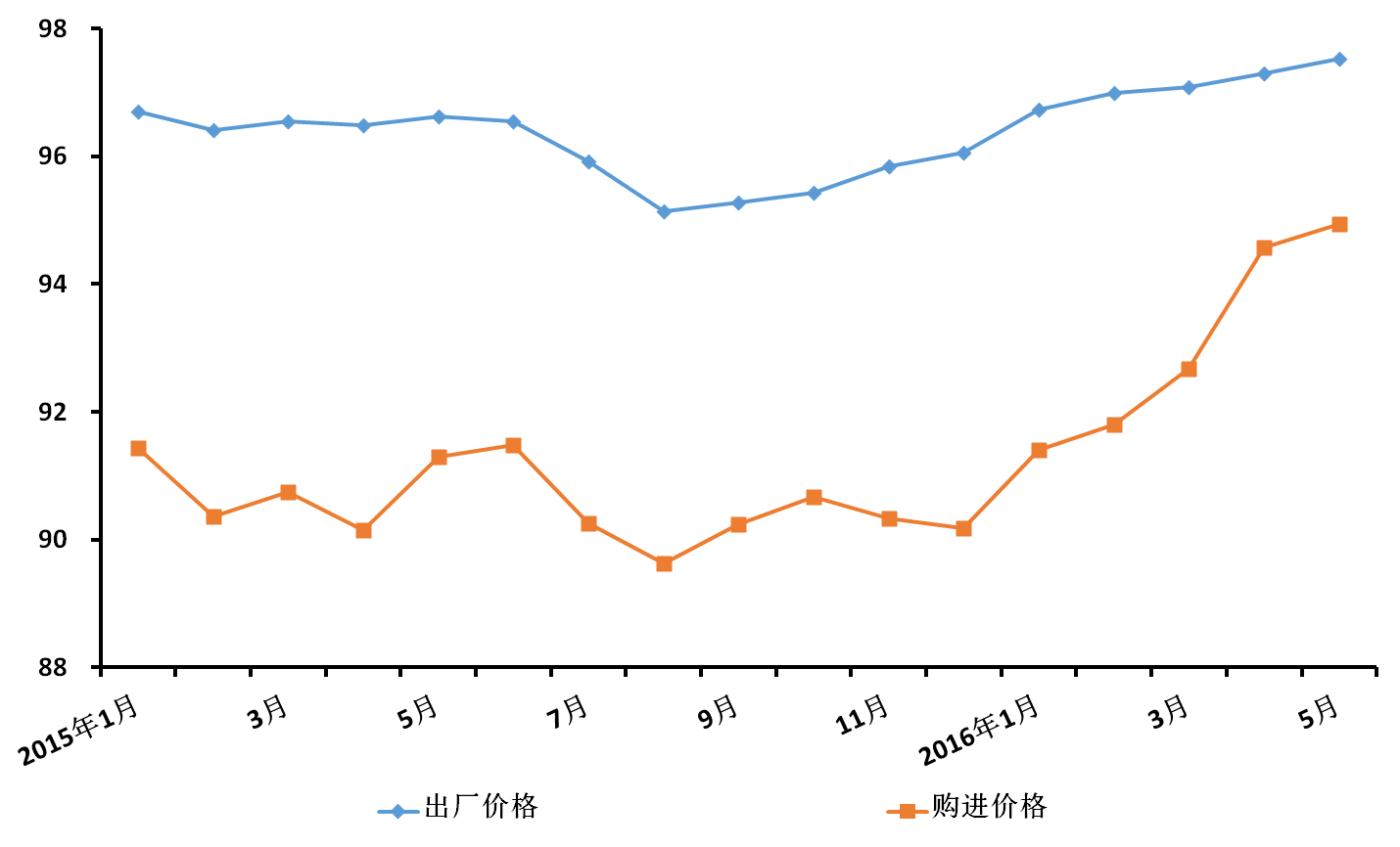 2016-06-19 来源:国家统计局上海调查总队5月份,本市工业生产者出厂价格总水平比去年同期下降2.5%,降幅比上月收窄0.2个百分点;购进价格总水平比去年同期下降5.1%,降幅比上月收窄0.3个百分点(见下图)。