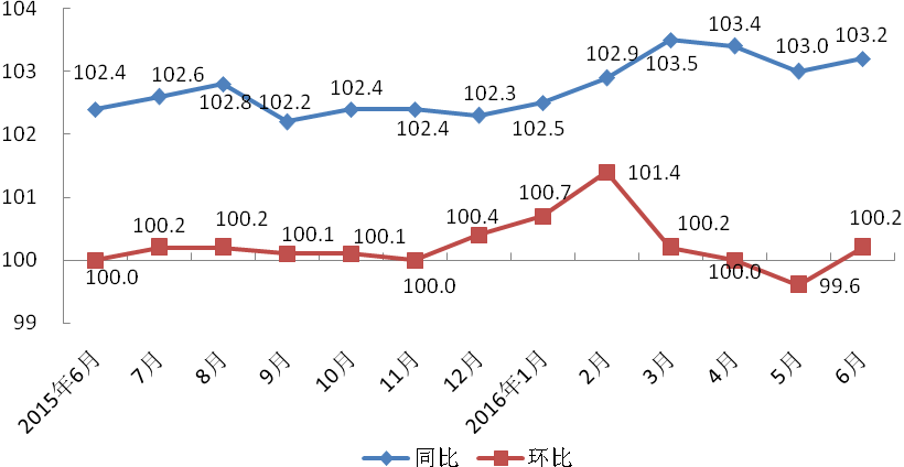 附图:2015年6月-2016年6月上海居民消费价格同、环比升幅走势