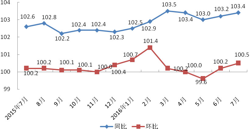 附图:2015年7月-2016年7月上海居民消费价格同、环比升幅走势