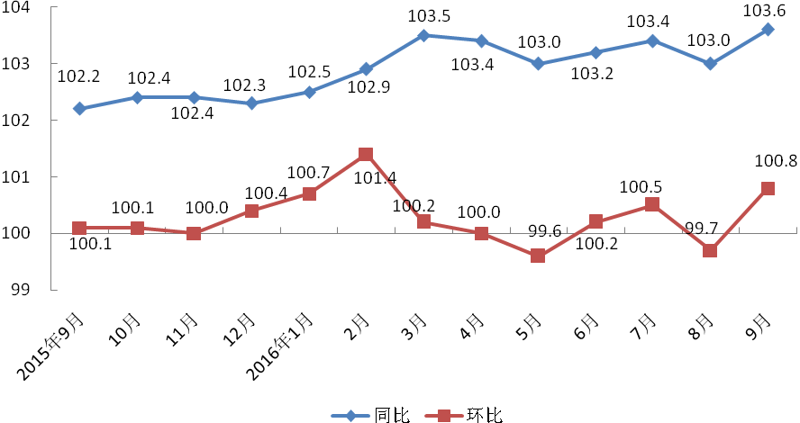 9月份本市居民消费价格同比上升3.6%