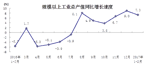 2017-03-15 来源:上海统计局2017年1-2月,本市规模以上工业(以下简称工业)企业完成工业总产值4987.97亿元,比去年同期增长7.3%(见下图)。
