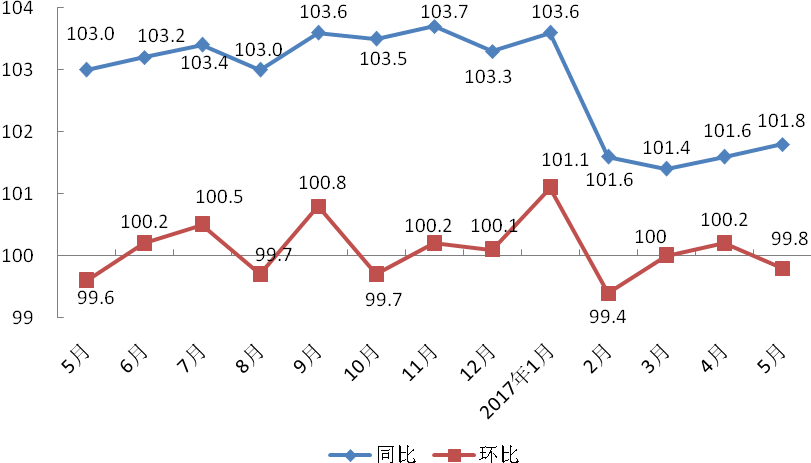 附图:2016年5月-2017年5月上海居民消费价格同、环比走势