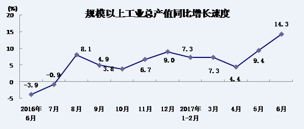 2017-07-19 来源:|2上半年,本市规模以上工业(以下简称工业)企业完成工业总产值16013.30亿元,比去年同期增长8.2%。其中,6月份工业企业完成工业总产值2863.48亿元,比去年同月增长14.3%(见下图)。