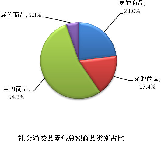分商品类别看,1-7月吃、穿、用、烧的商品零售额分别为1531.36亿元、1154.52亿元、3608.01亿元和354.02亿元,分别增长11.8%、13.8%、3.8%和12.6%,分别占社会消费品零售总额的23.0%、17.4%、54.3%和5.3%。