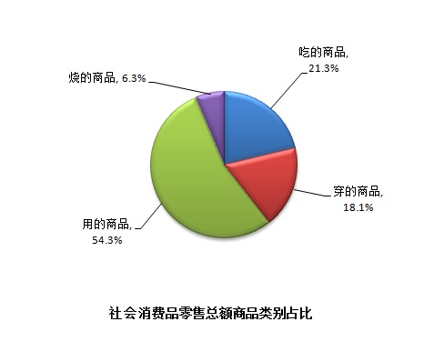 分商品类别看,1-11月吃、穿、用、烧的商品零售额分别为2292.37亿元、1945.32亿元、5853.51亿元和676.19亿元,分别增长9.1%、17.7%、4.7%和8.7%,分别占社会消费品零售总额的21.3%、18.1%、54.3%和6.3%。