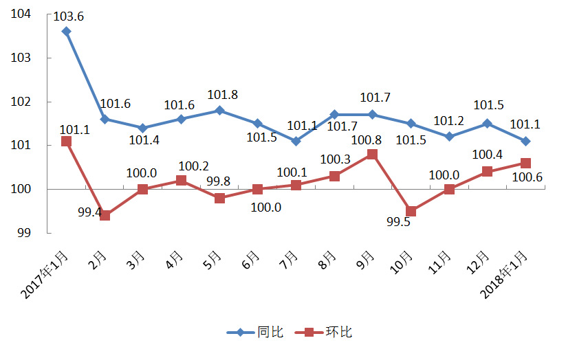 2017年1月-2018年1月上海居民消费价格同比和环比指数走势