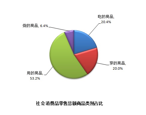 分商品类别看,上半年吃、穿、用、烧的商品零售额分别为1250.57亿元、1227.81亿元、3272.14亿元和392.78亿元,分别增长5.3%、17.5%、5.2%和8.3%,分别占社会消费品零售总额的20.4%、20.0%、53.2%和6.4%。