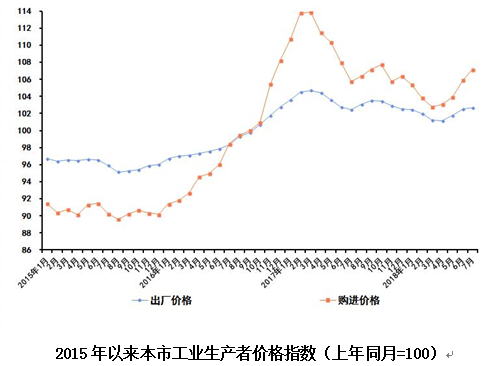 7月份,本市工业生产者出厂价格比去年同月上升2.7%,升幅较上月扩大0.1个百分点;购进价格比去年同月上升7.2%,升幅较上月扩大1.3个百分点(见下图)。