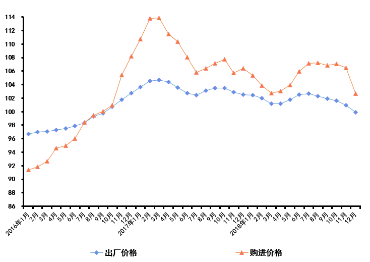 2019-01-17 来源:|212月份,本市工业生产者出厂价格比去年同月微降0.1%,上月为上升1.0%;购进价格比去年同月上升2.6%,升幅较上月收窄3.9个百分点(见下图)。