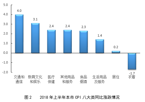 2018年,本市医疗保健类价格同比上升2.4%,升幅较上年同期回落4.2个百分点。房租价格同比下降0.5%,受此影响,居住类价格同比微升0.2%,升幅较上年同期回落1.5个百分点。线上线下折扣并行、促销活动频繁,衣着类价格同比下降1.7%。