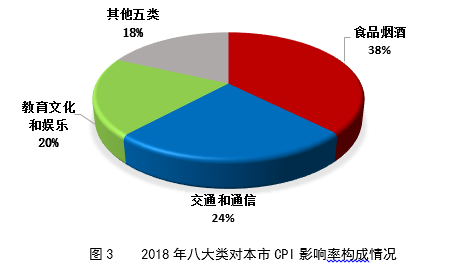 2018年,本市汽、柴油价格同比分别上升12.9%和14.4%,带动交通与通信类价格同比上升4.0%,上拉总指数0.4个百分点。受开学季学费上调影响,本市中小学教育收费同比上升22.0%;此外,学前教育同比上升6.4%,课外教育上升5.3%,综合影响下,教育文化和娱乐类价格同比上升3.1%,上拉总指数0.3个百分点。以上三大类对总指数影响率超八成(见图3)。