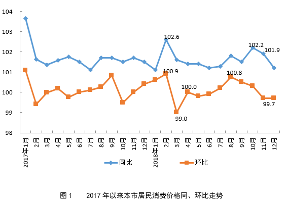 2018年,本市CPI稳中有升,同比上升1.6%,较上年同期回落0.1个百分点。各月同比呈“M”型走势,其中2月份和10月份同比分别上升2.6%和2.2%,其他月份均温和运行于“1”时代(见图1)。