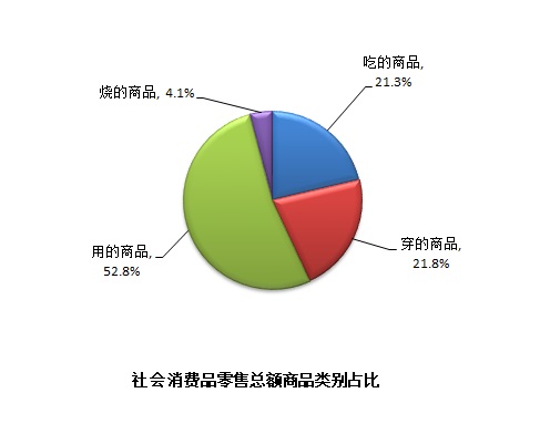 分商品类别看,上半年吃、穿、用、烧的商品零售额分别为1420.52亿元、1455.11亿元、3514.14亿元和271.67亿元,分别占社会消费品零售总额的21.3%、21.8%、52.8%和4.1%。其中,吃、穿、用的商品分别增长6.1%、8.1%、10.8%,烧的商品下降5.6%。