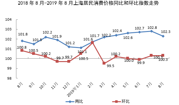 8月份,本市居民消费价格总水平比去年同月上升2.3%。从八大类看,食品烟酒类价格上升5.0%,衣着类价格上升3.3%,居住类价格上升2.2%,生活用品及服务类价格上升0.2%,交通和通信类价格下降4.2%,教育文化和娱乐类价格上升2.1%,医疗保健类价格上升1.9%,其他用品和服务类价格上升4.2%。