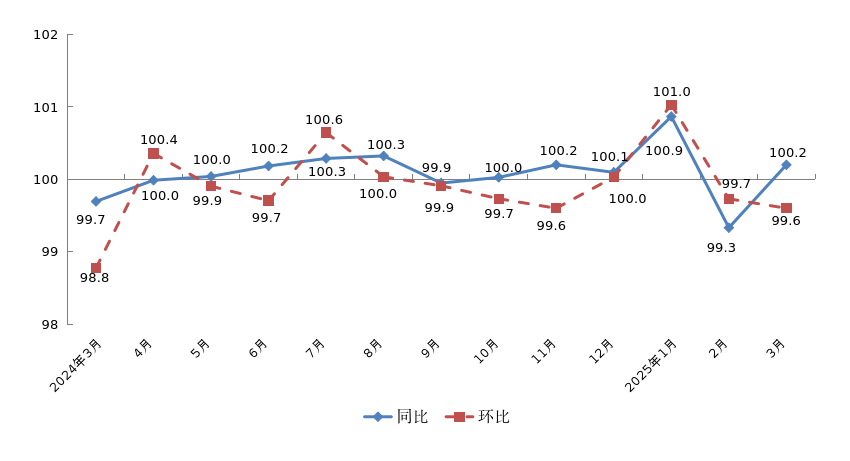 2024年3月-2025年3月上海居民消费价格同比和环比指数走势
