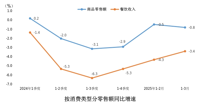 2025-04-251-3月,本市实现社会消费品零售总额4057.45亿元,同比下降1.1%。按消费类型分,1-3月商品零售额3559.85亿元,同比下降0.8%;餐费收入497.60亿元,下降3.4%。