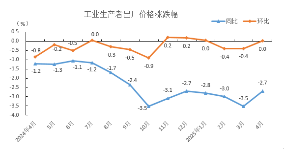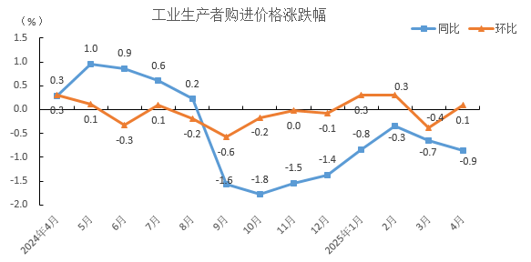 2025-05-122025年4月份,我市工业生产者出厂价格同比下降2.7%,降幅较上月收窄0.8个百分点,环比由上月下降0.4%转为持平;工业生产者购进价格同比下降0.9%,降幅较上月扩大0.2个百分点,环比由上月下降0.4%转为上涨0.1%。1—4月平均,工业生产者出厂价格比上年同期下降3.0%,工业生产者购进价格下降0.7%。