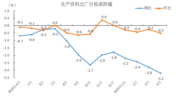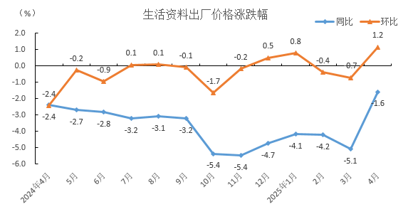 4月份,工业生产者出厂价格中,生产资料价格下降0.5%,影响工业生产者出厂价格总水平下降约0.35个百分点。其中,采掘工业价格下降2.1%,原材料工业价格下降1.8%,加工工业价格下降0.2%。生活资料价格环比上涨1.2%,影响工业生产者出厂价格总水平上涨约0.37个百分点。其中,食品价格下降0.2%,衣着价格持平,一般日用品价格上涨2.5%,耐用消费品价格上涨1.2%。