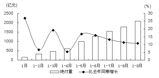 前三季度,本市工业投资881.91亿元,比去年同期下降2.8%,自1-4月以来已连续第6个月累计呈下降态势,但降幅比1-8月收窄1.1个百分点。随着各级政府对于工业投资重视力度的加强,各类产业配套政策的加快落实,以及航空航天、船舶制造等大型产业基地建设的不断推进,近几个月,本市工业投资项目新开工势头较好,本年新开工项目完成投资274.95亿元,增长9.9%,增幅明显快于全部工业项目。从储备大项目情况看,前三季度新开工计划总投资10亿元以上的工业项目8个,其中9月新开工2个,而去年前三季度新开工项目仅4个,这将对今后一段时期内本市工业投资的增长起到积极的推动作用。