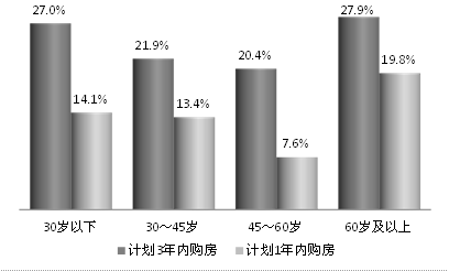 本市购房需求呈现年轻化和老龄化趋势。30岁以下和60岁以上的受访者购房意愿较为强烈,计划三年内购房的比重均在27%~28%(见图2)。