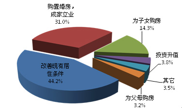 改善现有住房、安家置业等刚性需求是市民购房的主要动力。调查显示,计划三年内购房的受访者中,有44.2%是为了改善现有居住条件,31%是为了购置婚房、成家立业,两者合计为75.2%;14.3%是为子女购房,仅3.8%纯粹为投资升值购房(见图3)。这表明,改善现有住房条件,购置婚房、成家立业,以及为子女购房是购房的三大主因,市民购房刚性需求仍占主导地位。
