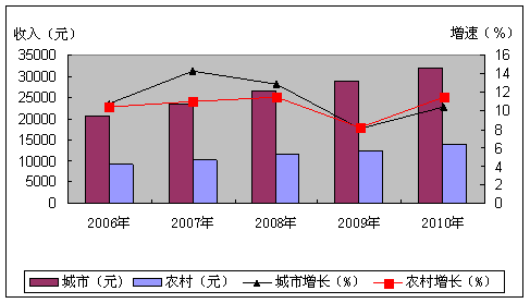 “十一五”时期,从城乡居民收入来源情况来看,四大项收入齐头并进,全部增长。工资性收入与经济增长紧密相关,虽然受到国际金融危机的波及,企业效益下滑、就业困难等原因影响了居民工资奖金收入,但在各级政府积极落实就业、鼓励创业、逐年提高最低工资标准等政策效应下,城乡工资性收入保持平稳增长。城市居民工资性收入从 2005年的12409元增长到2010年的21745元,增幅为75.2%,年均增长11.9%。农村居民工资性收入从 6364元增长到9606元,增幅为50.9%,年均增长8.6%。
