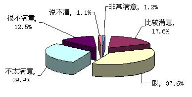 问及对目前生活状况是否满意时,有18.8%的受访者表示对目前生活状况满意;37.6%表示一般;42.4%表示不尽满意;另有1.1%表示说不清。这表明,近年来,在多数市民生活得到改善的同时,仍有相当部分市民对目前生活状况不尽满意。
