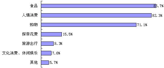 有85.7%的受访者表示2011年春节消费支出较多的项目为“食品”,82.3%表示为“人情消费”(红包、礼品、请客等),71.1%表示为“购物”(服装、家电、数码产品等),15.5%表示为“探亲花费”,9.3%表示为“旅游出行”,7.6%表示为“文化消费、休闲娱乐”。由此可见,食品、人情消费、购物为2011年居民家庭春节消费支出的三大重点。(见图6)