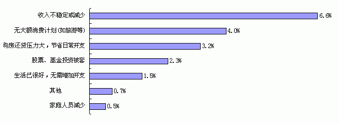 在预期2011年家庭消费持平或减少的受访者中,有6.6%认为是由于“收入不稳定或减少”;4%认为是“无大额消费计划”(如旅行等);3.2%认为是“购房还贷压力大”,需节省日常开支;2.3%认为是“股票、基金投资被套”;1.5%认为“生活已很好,无需增加开支”;选择其余原因的人数比例则不满1%。由此可见,“收入不稳定或减少”是部分居民家庭支出预期持平或减少的最主要原因(见图3)。