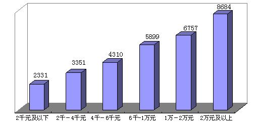 问及今年春节家庭消费支出是多少时,有21.3%的受访者回答在2千元以内,27.4%在2千-4千元,18.9%在4千-6千元,19.2%在6千-1万元,13.2%在1万元以上。经过加权平均计算,今年春节上海市民家庭平均消费支出额为5142元。从分组数据看有以下两个特点: