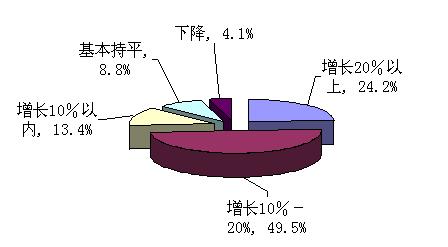 调查显示,有87.1%的受访者预期2011年家庭消费支出将增长,其中,24.2%预期增长20%以上,49.5%预期增长10%-20%,13.4%预期增长10%以内;8.8%预期基本持平;4.1%预期下降。这表明,2011年本市居民家庭消费支出总体预期增长,近九成预期家庭消费增长,且增幅较大(见图1)。