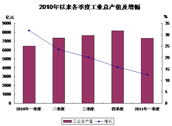 一季度,本市规模以上工业企业(下同)完成工业总产值7332.23亿元,比去年同期增长12.5%,虽然增幅较2010年第四季度回落3.3个百分点,但仍保持两位数增长(见下图)。其中,轻工业完成工业总产值1540.31亿元,增长13.6%;重工业完成5791.92亿元,增长12.2%。剔除季节因素,3月环比增长1.2%,生产呈基本平稳态势。