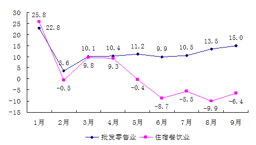 1-9月限额以上批发零售业、住宿餐饮业零售额增幅(%)