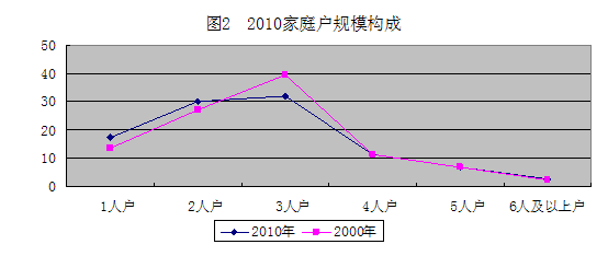 2、家庭户规模持续缩小,6成以上家庭为2人或3人户