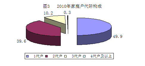 家庭户规模的缩小,必然伴随着本市家庭代际关系的变化。 “六普”资料显示,2010年一代户、二代户和三代户占上海家庭户总数的比重分别为49.9%、39.6%和10.2% ,其中一代户和二代户组成的家庭近九成。与2000年相比,二代户、三代户比重下降,而一代户上升了14.7个百分点,一跃成为本市最大的家庭户类型(见图3)。其中一代户又以两人户和一人户居多,分别占到一代户总数的57.3%和39.9%,这充分表明随着住房条件的改善和家庭观念的转变,越来越多的大家庭“裂变”为小家庭,未婚男女的独立意识也越来越强。