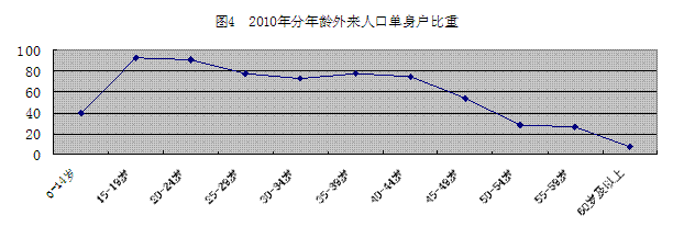 受上海良好的经济发展环境和生活、工作环境的吸引,越来越多的外省市人员,特别是年轻人来上海发展,形成单身户。2010年,本市单身家庭有142.27万户,占家庭户总数的17.2%,比2000年提高了3.8个百分点。其中外来人口占全市单身户的60.1%。分年龄组看,在20-44岁年龄中,单身家庭人口中外来人员的比重都超过7成,其中15-19、20-24和25-29岁年龄组比重为最高,分别占同年龄组的92.2%、90.2%和77.7%(见图4),而这三个年龄组也是外来人员来沪比重最高的年龄段。