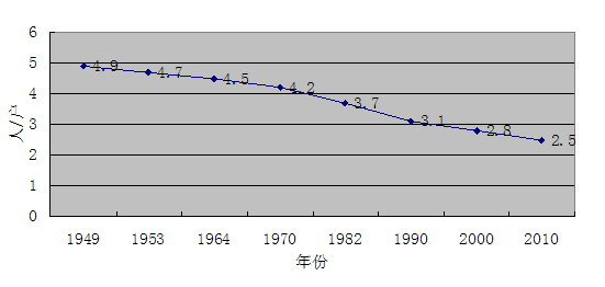 “六普”资料显示,2010年上海家庭户平均人数为2.5人,比2000年减少0.3人。建国以来,上海家庭户的户规模不断缩小,由1949年的户均4.9人缩减到2010年的2.5人(见图1)。分地区来看,规模最大的是金山区,为2.78人,最小的是崇明县,为2.22人。家庭户规模的不断缩小不仅是生育水平下降和其他社会、经济、文化等多种因素影响的结果,更是21世纪以后,上海居民住房条件和居住环境不断改善,生活水平、生活质量不断提高的结果。