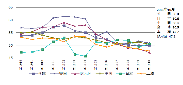 10月份,在全球编制制造业采购经理指数的26个国家中,仅10个国家指数位于临界值上方,显示全球制造业经济停滞正在波及越来越多的国家(新西兰尚未公布10月指数)。数据显示,欧元区国家能否从主权债务危机中成功走出是未来全球制造业经济增长与否的重要因素(见附表2)。