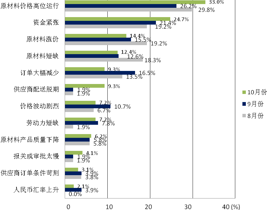从问卷情况来看,在反映问题的企业中(占调查企业总数的近三成),原材料价格仍是企业采购经理最为关心的问题(54.6%,比上月上升2.2个百分点。部分企业同时反映多个问题,故百分比总计超过100%)。其中,反映原材料持续高位运行的企业最多,占33%,上升6.8个百分点,表明持续高位运行的原材料成本正在考验企业盈利能力及资金实力,迫使企业思考转型策略。反映原材料上涨的企业继续减少,占14.4%,下降1.1个百分点,已连续第4个月下降,显示有关价格调控的一系列政策效果逐步显现,通胀情况得到一定遏制。但企业采购经理们所期望的原材料价格恢复平稳较低的运行区间则有待逐步实现,本月反映原材料价格大幅波动的企业占7.2%,下降3.5个百分点(见图6)。