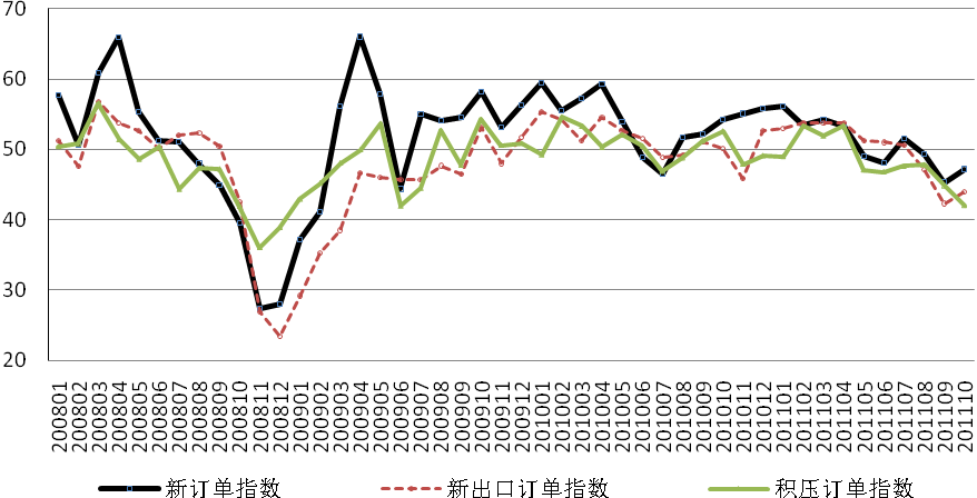 10月份,生产指数为47.1,比上月下降3.4点,再度跌入收缩区(见图2)。自9月份生产指数在积压订单的带动下出现短暂回升后,本月又迅速下滑至收缩区。分行业看,食品制造业和纺织业生产指数有所上升,饮料制造业、造纸及印刷业、非金属矿物制品业、黑色金属冶炼及压延加工业、金属制品业、交通运输设备制造业、专用设备制造业和通讯设备计算机及其他电子设备制造业有较大幅度下降。