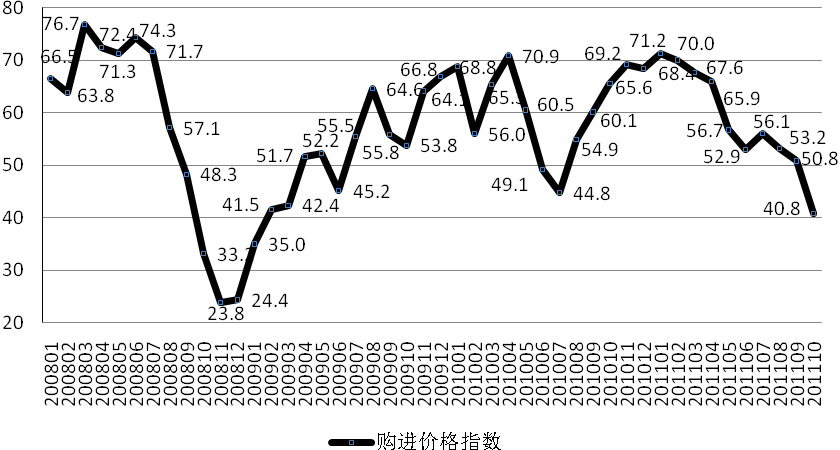 10月份,原材料购进价格指数为40.8,比上月大幅下降10点,在连续14个月位于扩张区后,首度跌至收缩区(见图4)。数据显示,前期原材料购进价格涨势持续趋缓,终于在本月出现下降,表明通胀得到一定程度的抑制。分行业看,除了烟草制品业和木材加工及家具制造业外,其余行业原材料购进价格指数均出现下降,其中纺织业、造纸及印刷业、石油加工及炼焦业、化学原料及化学制品业、黑色金属冶炼及压延加工业和通用设备制造业下降幅度较大。