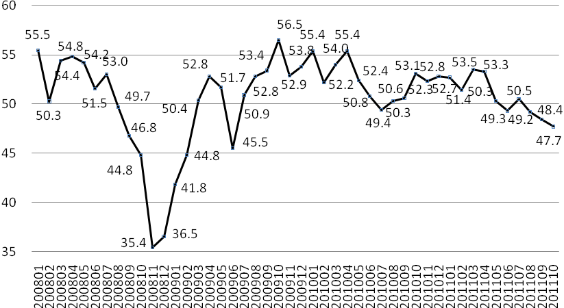 国家统计局上海调查总队 2011-11-1410月份,本市制造业采购经理指数(PMI)为47.7,比上月下降0.7点,连续第3个月在临界值下方震荡下行,创下自2009年7月份以来最低点(见图1)。调查显示,构成制造业PMI的5个分项指数呈“一升四降”格局且皆位于收缩区。其中,新订单指数上拉指数0.6点,生产指数、原材料库存指数、从业人员指数和供应商配送时间指数各下拉指数0.9点、0.2点、0.1点和0.1点。非构成制造业PMI的4个分项指数比上月均有所下降(见附表1)。数据显示,PMI总指数及各分项指数均运行于收缩区,除新订单指数和新出口订单指数外,其余各分项指数皆呈下行走势。受国内外经济多重因素影响,市场需求继续萎缩,本市制造业生产发展速度进一步放缓。同时,通胀回落趋势明显,原材料购进价格持续上涨态势得到初步遏制。