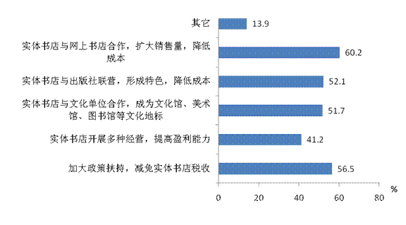 近年来,实体书店在网络书店以及电子书的冲击下,纷纷陷入经营困境。当问及对实体书店发展的建议时,60.2%的受访者选择“实体书店与网上书店合作,降低成本”,其他依次为“加大政策扶持,减免实体书店税收”、 “实体书店与出版社联营,降低成本”和“实体书店与文化单位合作,成为非营利为主的文化地标”,比例为56.5%、52.1%和51.7%。可见,大多数受访者认为,实体书店应走开放式合作经营之道,并加大对其的政策扶持力度(见图5)。