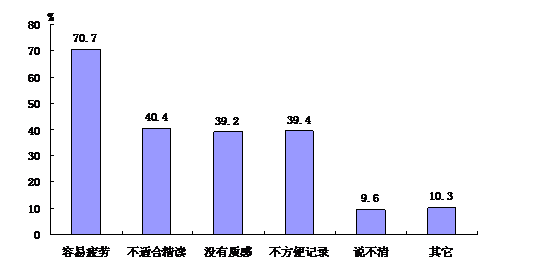 当问及数字化阅读的主要好处时,选择“方便信息搜索”、“获取途径便利”和“内容丰富”的受访者分别为71.2%、65.3%和57.7%。但数字化阅读也存在不可忽视的缺点。当问及“数字化阅读的主要缺陷”时,选择“容易疲劳”的占70.7%,远高于其他选项。