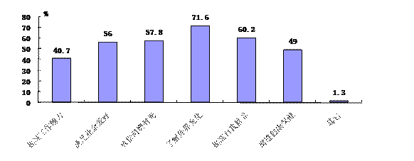 对于阅读目的,71.6%的受访者选择“了解外界变化”,比重在各选项中居于首位;而“提高自我修养”、“放松消磨时光”、“满足业余爱好”等选项的选择比重也居于前列,分别为60.2%、57.8%和56%,显示受访者阅读目的以开阔眼界、休闲放松为主;选择“提高工作能力”的受访者占40.7%(见图2)。