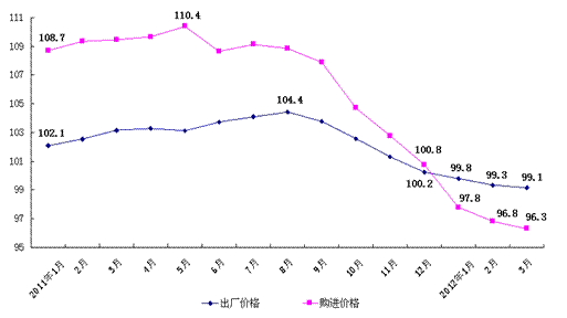 一季度,受基期价格水平偏高和部分企业下调产品出厂价格等因素影响,在本市工业生产者出厂价格调查的35个工业行业中(注:从2012年1月份起,工业生产者价格统计调查采用新的国民经济行业分类),产品价格同比下降的行业有13个,下降面同比扩大17.1个百分点。其中黑色金属冶炼和压延加工业、有色金属冶炼和压延加工业、汽车制造业和非金属矿物制品业产品出厂价格分别下降10.4%、9%、3.6%和3.3%,上述4个行业共影响出厂价格总水平同比下降1.2个百分点。